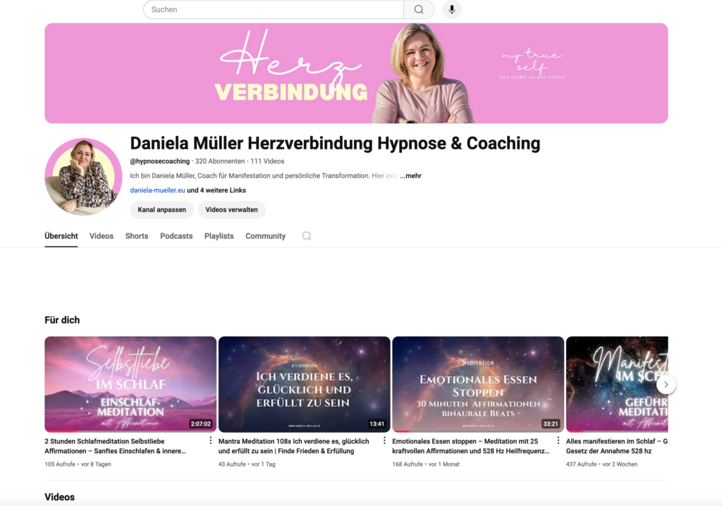 Auf meinem YouTube-Kanal findest du eine einzigartige Mischung aus tiefgehenden Meditationen, Hypnosen und Wissen, die dich auf deinem Weg zu einem bewussteren und erfüllten Leben begleiten. Neben kraftvollen Techniken zur Manifestation und zum Loslassen liegt ein Schwerpunkt auf den Themen emotionales Essen und Nervensystem-Regulation.