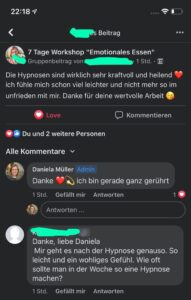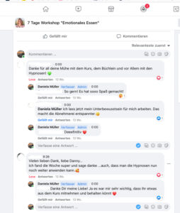 Im neuen Kurs geht es nun aber erstmal darum, herauszufinden, ob man Emotionaler Esser ist und seine Trigger-Momente herauszufinden. Wir arbeiten mit intensiven Hypnosen, die es auch zum Download gibt, mit Energiearbeit und lernen Werkzeuge um die Ess-Momente achtsam zu entschlüsseln und zu dann auch verhindern. Wir arbeiten intensiv in der gemeinsamen Facebook-Gruppe und danach bei Bedarf auch gern weiter.