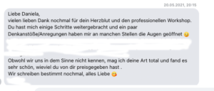 Wenn Du mehr zu diesem und den weiteren Workshops erfahren möchtest, lade ich Dich herzlich zu meinem Info-Abend per Webinar ein. Das Webinar findet am Mittwoch-Abend – also dem 25.8.2021 um 19:30 statt. Da ich mit keiner Webinar-Software im Moment wirklich glücklich bin, findet der Info-Abend Live in meiner Gruppe auf Facebook statt: